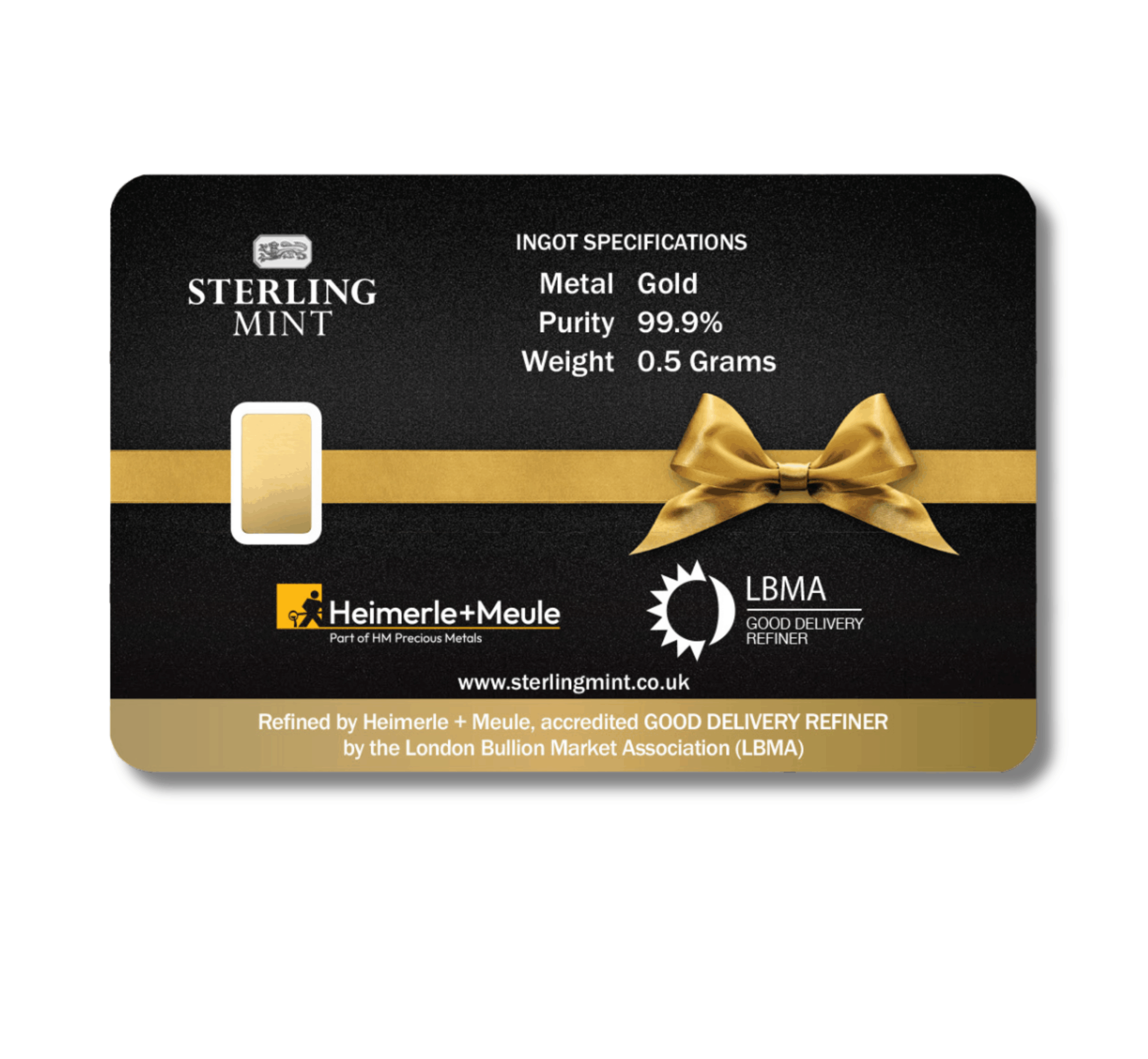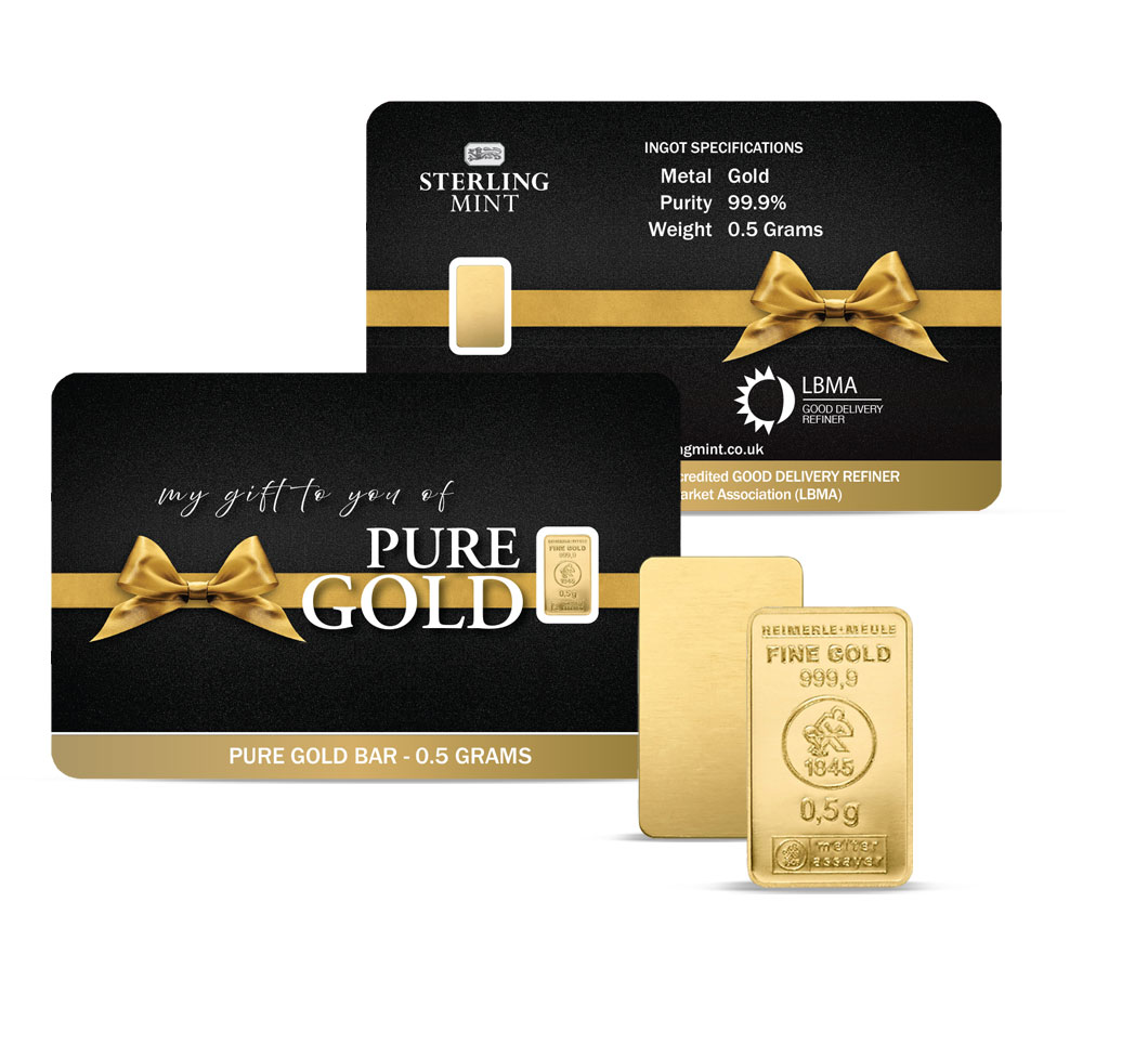 These convenient bullion cards each contain a half-gram bar of 24 carat gold.